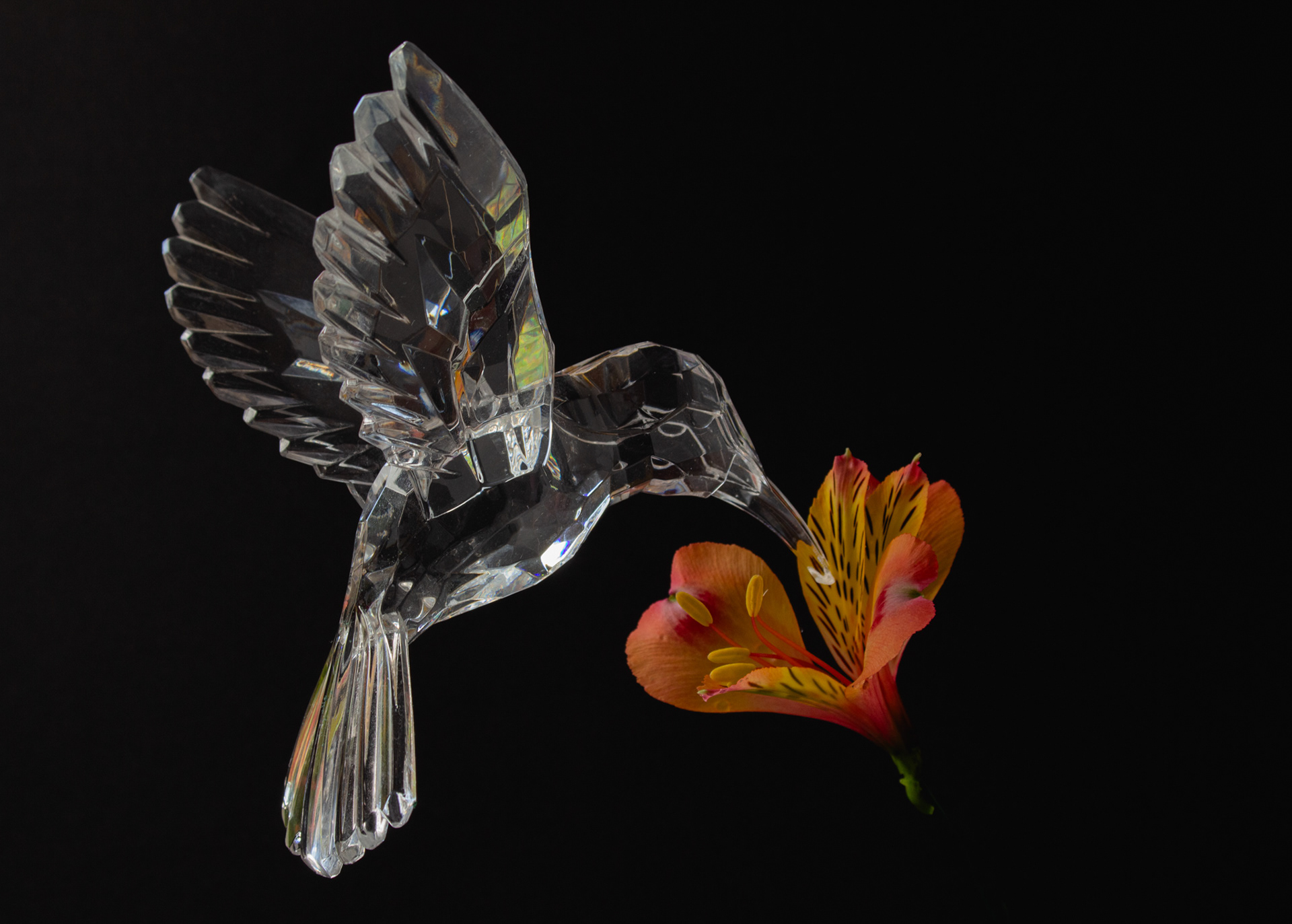 Orange lily with a glass hummingbird against a black backdrop using natural lighting
